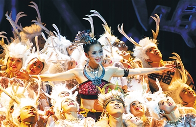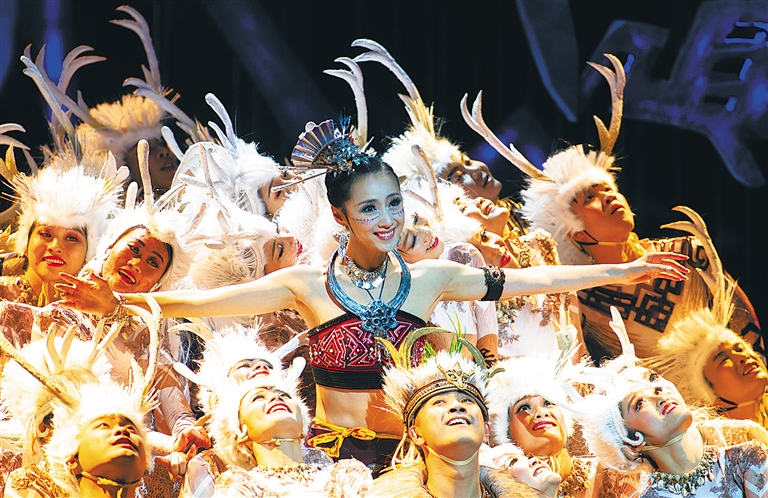 演出中,演员们以灵动舞姿表现成群坡鹿,又以黎族元素歌舞向观众展示黎族婚礼等场景,还通过钱铃棍、叮咚等多种黎族传统乐器和用具,奏响了具有现代气息的节奏,展示了黎族人民劳作的场景。