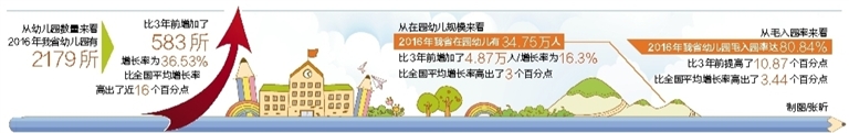 在此基础上,我省学前教育改革发展迈上了新的台阶。从幼儿园数量来看:2016年我省幼儿园有2179所,比3年前增加了583所,增长率为36.53%,比全国平均增长率高出了近16个百分点;从在园幼儿规模来看,2016年我省在园幼儿有34.75万人,比3年前增加了4.87万人,增长率为16.3%,比全国平均增长率高出了3个百分点;从毛入园率来看,2016年我省幼儿园毛入园率达80.84%,比3年前提高了10.87个百分点,比全国平均增长率高出了3.44个百分点。