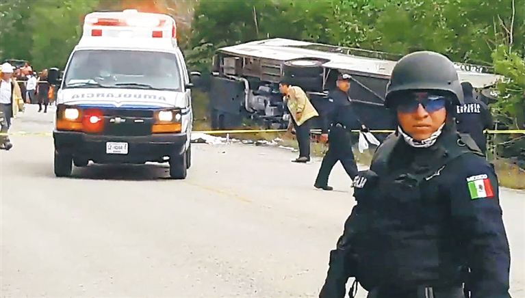 这张12月19日的视频截图显示的是,在墨西哥金塔纳罗奥州,警察在事故现场戒严。 墨西哥金塔纳罗奥州政府19日说,该州当天发生一起公路交通事故,造成12人死亡、10多人受伤。 新华社/法新