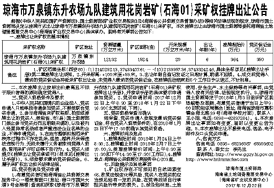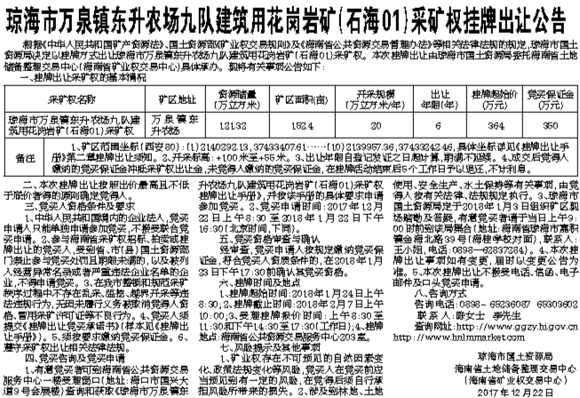 琼海市万泉镇东升农场九队建筑用花岗岩矿(石海01)采矿权挂牌出让公告