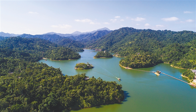 12月17日,位于保亭黎族苗族自治县的神玉岛文化旅游度假区气候宜人,美景如画。作为“保亭十景”之一,游人在此可泛舟碧波,可探秘雨林、可赏玉石文化、更可静心康养。保亭以创建国家全域旅游示范区为契机,努力把全县打造成为一个大景区,“雨林温泉谧境,国际养生家园”目标逐渐接近,成效初步显现。据悉,今年1月至11月全县接待游客533.59万人,同比增长20%;实现旅游综合收入12.24亿,同比增长43.9%。 本报记者 王凯 摄