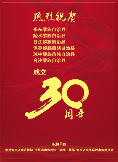 热烈祝贺 乐东黎族自治县 陵水黎族自治县 昌江黎族自治县 保亭黎族苗族自治县 琼中黎族苗族自治县 白沙黎族自治县 成立30周年