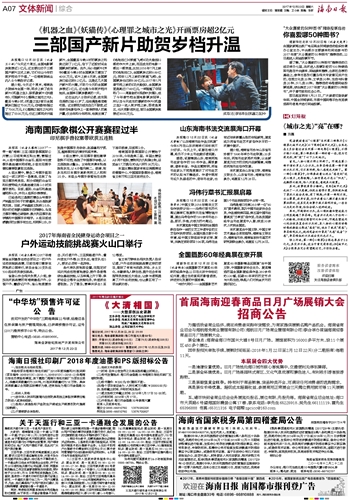 海南日报 文体新闻综合 007 2017-12-231 2017年12月23日 星期六