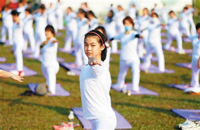 “我和妈妈一起报名参加,第一次和这么多人一起练习瑜伽感觉很棒,我觉得在户外做动作明显气场更足。”参加者陈怡笑着说,她的女儿正作为观众在一旁给妈妈和外婆加油打气。