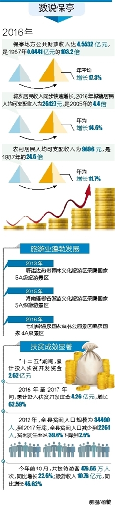 自脱贫攻坚的号角吹响以来,保亭扶持资金大幅增加, “十二五”期间,该县累计投入扶贫开发资金2.62亿元,2016年至2017年间,累计投入扶贫开发资金4.26亿元,增长62.59%;2012年,全县贫困人口规模为34490人,到2017年底,全县贫困人口减少到2261人,贫困发生率从39.6%下降到2.5%。