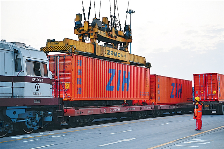12月25日,郑州铁路集装箱中心站的大型门吊为第1000班中欧班列(郑州)装货。 这是中欧班列(郑州)2013年首趟开行以来的第1000班列车。 中欧班列(郑州)始于郑州,沿着古丝绸之路,经亚欧大陆桥直达德国,为地处内陆的河南省打开了通往欧洲的重要通路。 新华社记者 冯大鹏 摄