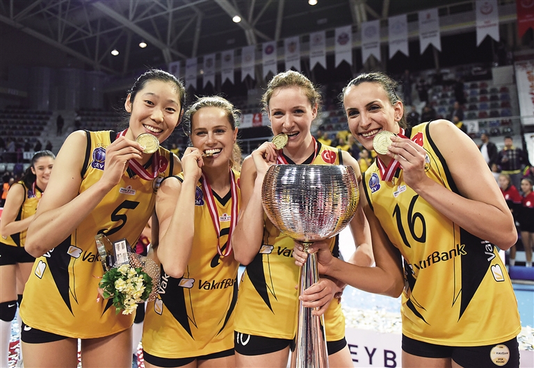 当地时间12月24日,在安卡拉举行的2017-2018赛季土耳其杯女排决赛中,朱婷率领瓦基弗银行队以3:0战胜埃扎杰巴瑟队,夺得冠军。朱婷获得本届赛事最有价值球员奖。图为朱婷(左)与队友在颁奖仪式上合影。新华社发