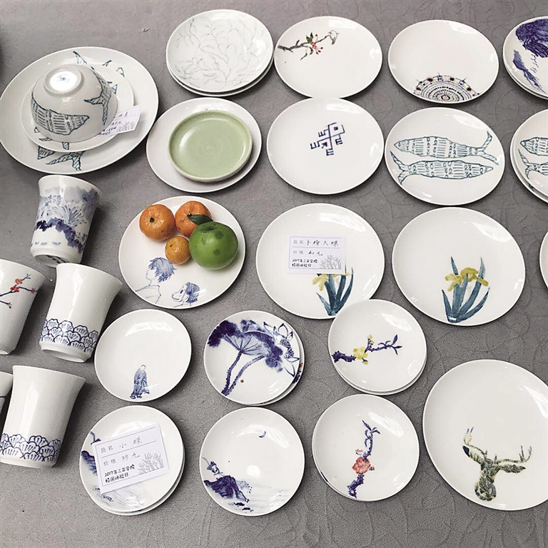 “这个荷花小碟是釉下彩,每只40元;这个像牛角一样的器具是瓷器音响……”三亚学院艺术学院产品与设计专业学生张林波向前来咨询的人们逐一介绍。这些小碟、杯子、小碗等青花瓷器,都是该校中国画工作室学生利用暑假前往景德镇制作而成的。