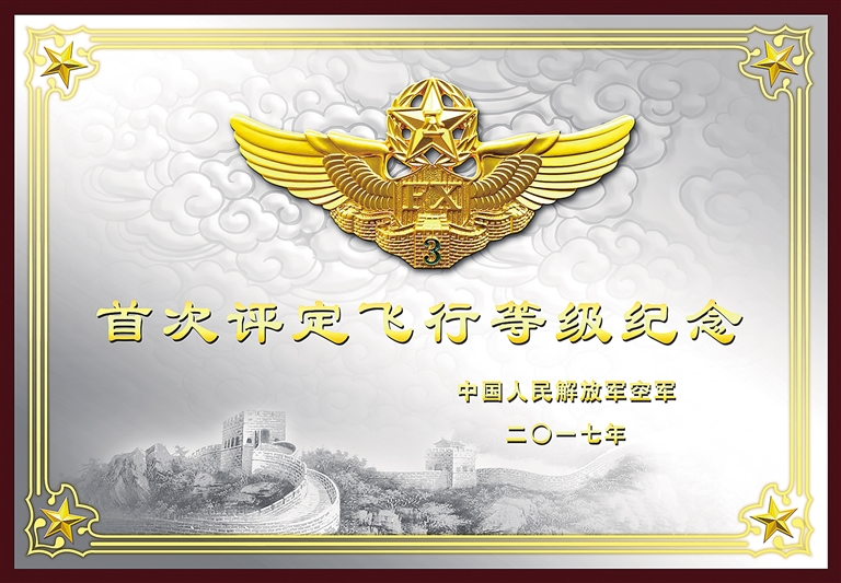 图为“首次评定飞行等级纪念”牌。 中国空军加强软实力建设推出新举措。12月26日在济南举行的一个特别仪式上,一批“90后”飞行员及家庭代表获得空军颁发的“首次评定飞行等级纪念”牌和“空军飞行员光荣家庭”荣誉匾,民政部和辽宁、吉林、黑龙江、山东、河南5省有关部门领导,共同见证了飞行员家庭共享飞行荣光的重要时刻。 新华社发