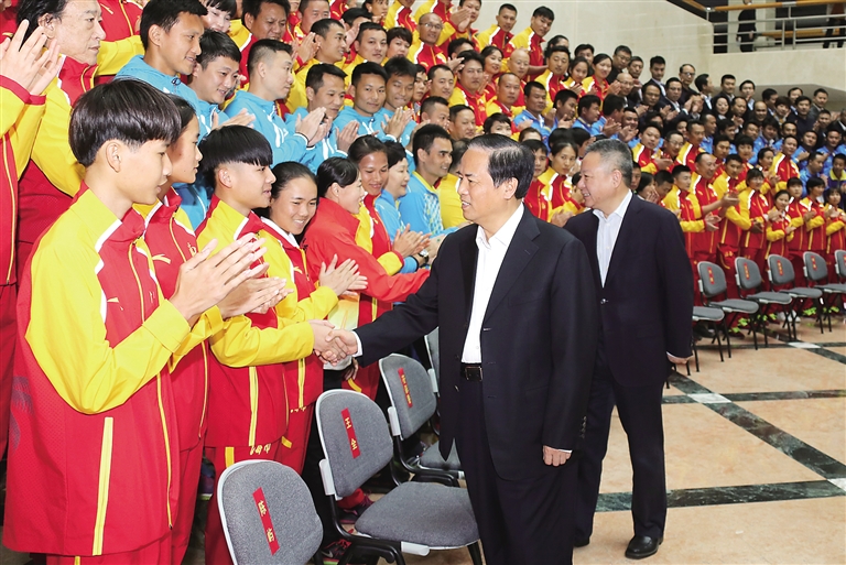 刘赐贵指出,回顾总结海南建省办经济特区30年的历程,体育工作者也作出了重要的贡献。比如,琼中女足在艰苦的生活训练条件下,刻苦训练、努力拼搏,多次获得全国比赛和国际赛事冠军,为国家、为海南争得了荣誉,充分体现了敢闯敢试、敢为人先、埋头苦干的特区精神,堪称海南体育的王牌。刘赐贵号召全省体育工作者乃至各行各业以琼中女足为榜样,励志拼搏,为海南的体育事业再添光彩,在各自岗位上力争第一。