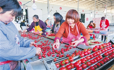 12月25日下午,在陵水黎族自治县特产品电商集配物流中心,一颗颗饱满鲜红的圣女果被装进新设计的包装盒中,准备发往全国各地。