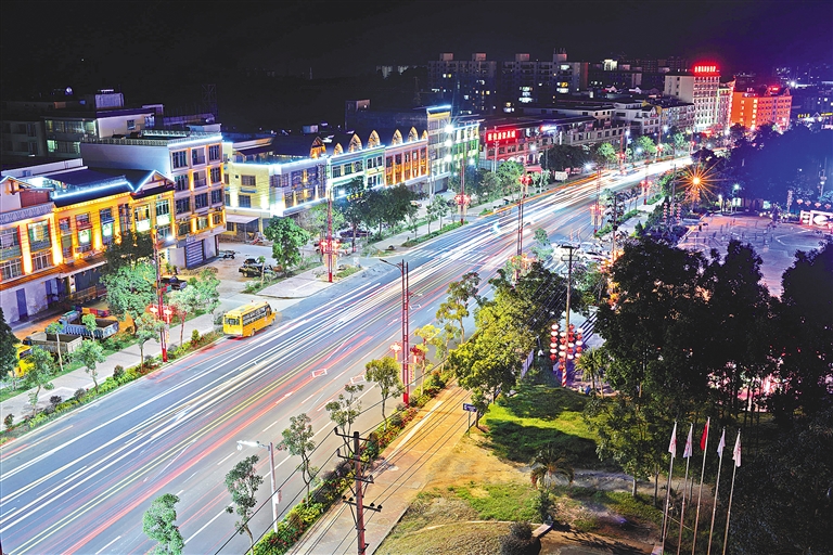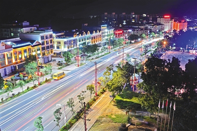 穿行在琼中黎族苗族风情浓郁的营根县城街道,仿佛走进一座五彩缤纷的童话小镇。临街的商铺、酒店、宾馆、民居楼墙体换上了“艳妆”:船型屋、甘工鸟、大力神等民族图腾,镶嵌在五颜六色的线条、穹顶上,黎苗风情浓郁。宽阔平坦的新路面两旁,火焰木、紫荆树、三角梅等树种花颜怒放,与精致的交通标识、门头牌匾和广告牌相互映衬,形成一道亮丽的风景线。