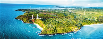 儋州市峨蔓镇位于该市北面,濒临浩瀚的北部湾海洋。该镇海岸沿线,一个接一个地矗立着风电设施,那高高的塔柱上,螺旋桨越转越快,宛如无数架直升飞机即将凌空而起。远远望去,这些风电设施,仿佛给儋州大地装上了腾飞的引擎。目击如此壮观的景象,让人油然而生诗一般的激情。图为峨蔓镇临海地段的壮观风景。文/本报记者 易宗平 图/特约记者 吴文生