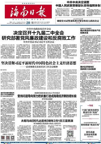 海南日报 头版 001 2017-12-281 2017年12月28日 星期四