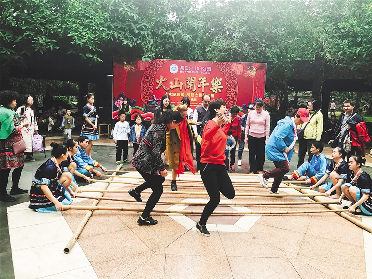 12月30日,海口火山口地质公园,游客跳起欢乐的竹竿舞。元旦小长假首日海口各景区接待游客5.6万人次。文/本报记者 邓海宁