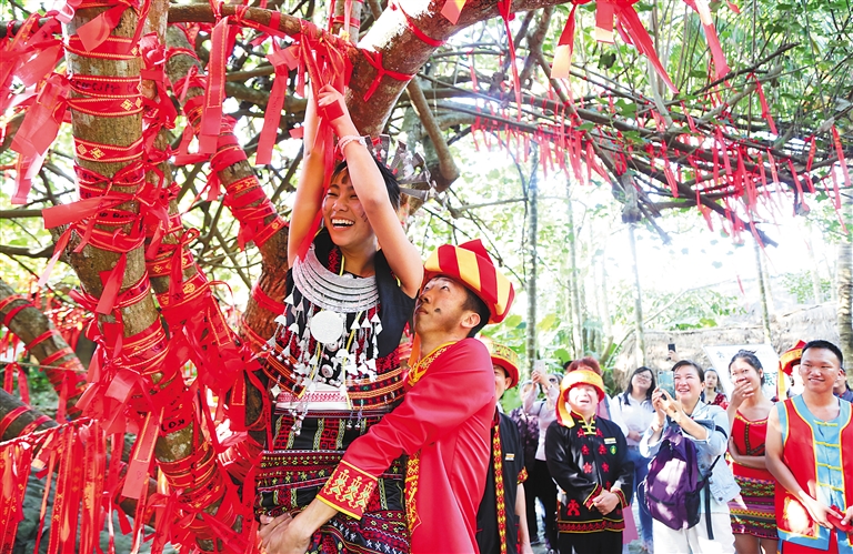 1月1日,海南槟榔谷黎苗文化旅游区推出黎族传统婚礼巡游体验项目,通过对黎族传统婚礼全景演绎,让更多游客体验到独特的黎族文化。