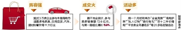 据了解,“海购节”目前已成功举办两届,并逐渐成为全省人民的年度购物狂欢庆典,知晓度和影响力不断提升。有超过3万家企业参与本届“海购节”,涵盖了家电家具、日用百货、汽车、建材和餐饮等11大行业。本届“海购节”收获了一份靓丽的成绩单,据不完全统计,参与商家销售额72.6亿元,与第一届相比增长15.3%,参与人数达3.4亿人次。