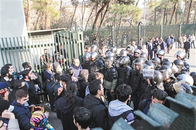 这是2017年12月30日,在伊朗首都德黑兰,警察阻止大学生参加示威活动。新华社/美联