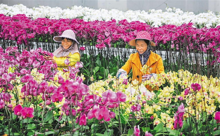 近日,在海口兰花产业园,工作人员正整理兰花准备打包。据初步计算,2017年我省新增花卉苗木种植面积3700亩,预计花卉苗木年总产值可达23.1亿元。目前,全省已有23个热带花卉产业重点项目被列入各市县重点项目推进表,通过以重点项目为抓手,加快建设集研发、种植、加工、销售为一体的市场新型经营主体,促进花卉产业“接二连三”融合发展。