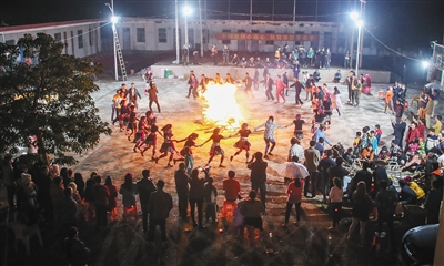 “我们的山村很美丽,我们小妹很靓丽,我们小伙很英俊……”山歌再次响起,这次不只是卢家召一个人唱了,村里男女老少一起大合唱。歌声欢快,脚步更加欢快,十多位身着苗族节日服装的女子迈入竹竿舞阵。而在广场中央,更多人则是手拉着手围着篝火组成一个大圈,一边唱着歌,一边跳着篝火舞。