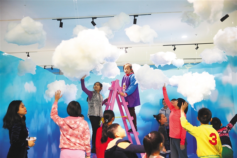 据了解,此次青少年绘画摄影展按照春、夏、秋、冬四季变化为线索来展示。这些参展的作品,用简洁的线条、绚丽的色彩、纯真的理念,勾勒出青少年心中的美好愿景,展现他们向往美好未来的心声。图为展区内,孩子们在用环保材料手工制作成的童趣场景中触摸“蓝天白云”。