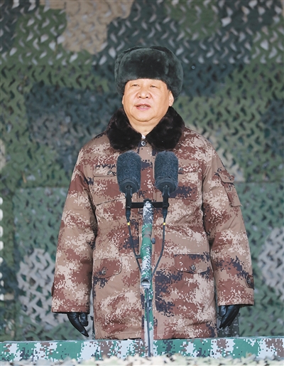 习近平通过视频校阅了各军兵种和武警部队野外分会场开训情况。塞外北国千里冰封,陆军某合成旅官兵顶风冒雪,展开实弹实装训练;南国军港波飞浪卷,海军陆战队展开登陆装载训练;冀中平原一望无垠,空军某试验训练基地展开空中对抗、对地突击训练;江南丘陵层林尽染,火箭军某导弹旅展开测试转载训练;京郊大地寒气袭人,武警北京总队展开应急处突训练……
