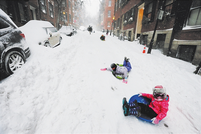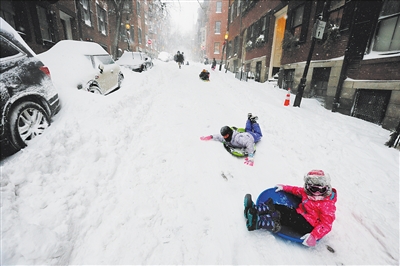 1月4日,在美国东北部马萨诸塞州波士顿,孩子们在雪地上滑行。 罕见暴风雪3日晚至4日席卷美国东北部,部分地区宣布进入紧急状态,一些航班被取消。