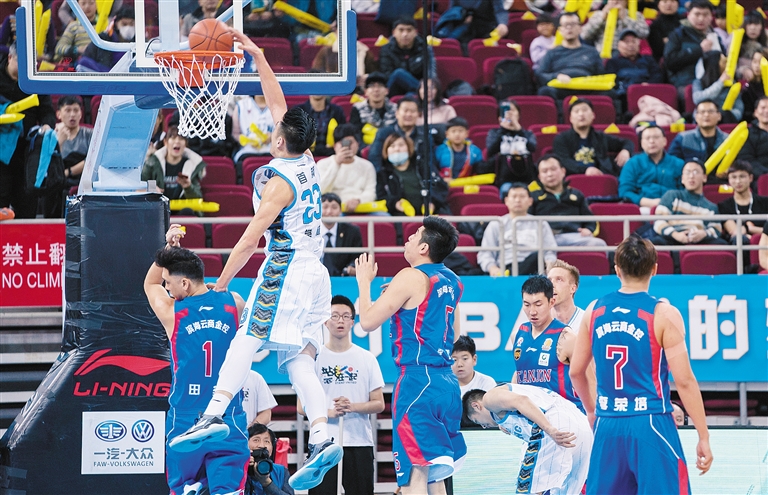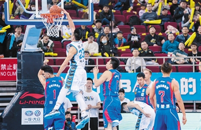 图为北京首钢队球员常林(上)在比赛中扣篮。 新华社发