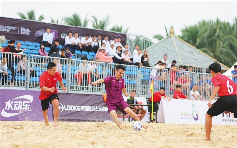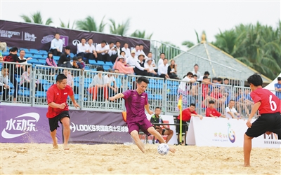 1月6日,海南亲水运动季沙滩足球巨星挑战赛在陵水黎族自治县清水湾开幕。比赛共有来自我省多个市县的16支队伍参与,前巴西国脚里瓦尔多、前中国男足国家队队员杨晨助阵参赛。7日还将设有球星见面会与“海脚王”全民挑战赛环节,热爱足球的市民游客可以零距离接触球星,还能亲自上场进行沙足趣味比拼。文/本报记者 苏庆明 图/通讯员 陈思国