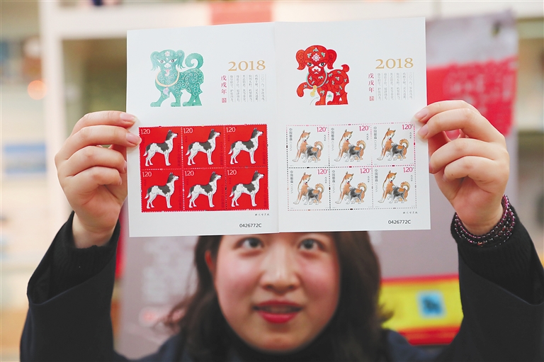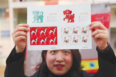 1月5日,在浙江省宁波市一邮政网点,工作人员展示《戊戌年》生肖邮票小版张。当日,中国邮政发行《戊戌年》特种邮票1套2枚,小本票1本。图案内容分别为“犬守平安”和“家和业兴”。该套邮票延续了第四轮生肖票“合家欢”的设计理念,展示了中华田园犬的形象。 新华社发