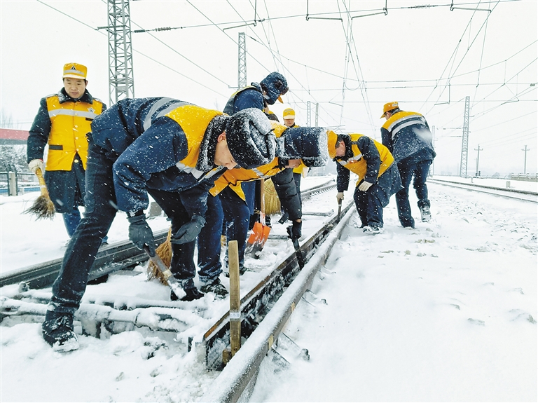1月6日,中国铁路郑州局集团有限公司龙门车务段职工在进行除雪打冰作业。 当日,河南再次迎来强降雪,中国铁路郑州局集团有限公司管内各系统启动应急预案,加大各车站客流组织,强化线路、接触网、车辆等重点岗位重点安全卡控,确保旅客出行安全。 新华社发