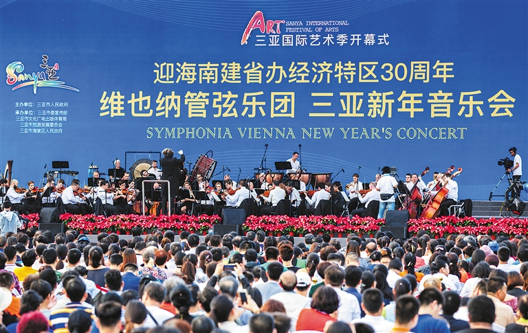 暖阳之下,三亚市海棠湾艺海棠艺术综合体大草坪上,上千听众沉浸在高雅音乐的艺术享受中。“啦啦啦,啦啦啦!”维也纳管弦乐团成员一边演奏,一边开腔齐唱,如此花式表演亦庄亦谐,让人忍俊不禁。乐团演奏的另两首嬉游曲,甚至包含了《我爱北京天安门》的一段旋律,贴近中国听众的集体记忆,也令现场不少人会心一笑。在最后谢幕的安可曲中,指挥家一个调皮的示意,又送出了管弦乐版的《万泉河水清又清》《山丹丹花开红艳艳》,演奏家们在最后3个音符落下的同时喊出“新年好!”引得全场观众又一次爆发出热烈掌声。