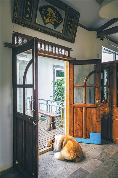 在“花梨之家”的庭院里,有只白鸭不惧小雨在草丛中慵懒地踱步,不知名的野花在嫩绿的草丛间愈发鲜艳,门口那只蜷缩成一团的小狗正酣然入睡,此刻的村庄安静得只听见雨声。