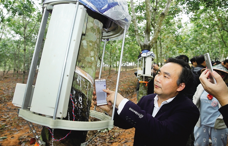 1月7日,一名技术人员在用手机APP演示全自动化智能割胶系统开机功能。当日,海胶集团全自动智能割胶系统技术测试演示在红光分公司橡胶园举行。