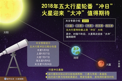 天文专家表示,火星“大冲”是观测火星的最佳时期。届时,橙红色的火星将是高悬子夜中天的一颗耀眼“明星”。太阳一落山,它即从东南方向升起;至次日早晨,太阳从地平线上升起时,它才从西边落下,人们可通宵观赏火星神奇而迷人的风采。