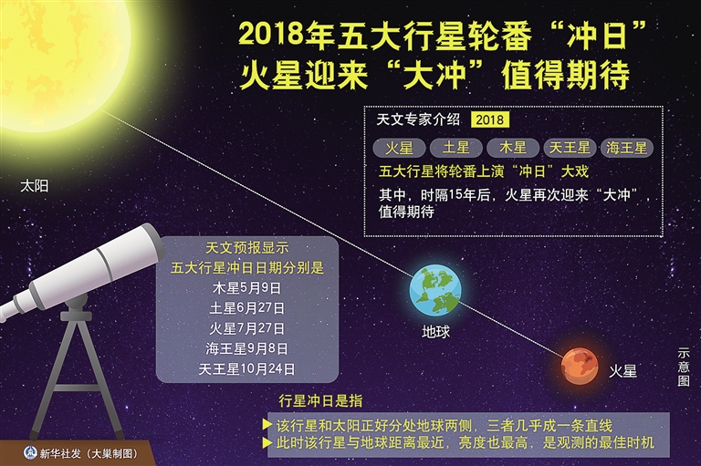 天文预报显示,五大行星冲日日期分别是:木星5月9日、土星6月27日、火星7月27日、海王星9月8日、天王星10月24日。