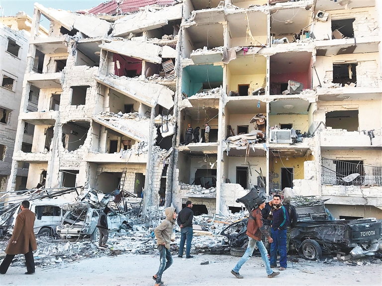 1月8日,在叙利亚伊德利卜省首府伊德利卜市,人们在爆炸现场查看情况。 叙利亚西北部伊德利卜省7日晚发生一起汽车炸弹袭击事件,造成至少20人死亡、数十人受伤。 新华社/法新