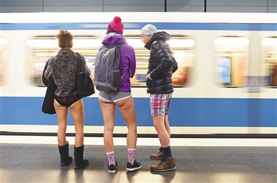 1月7日,在德国慕尼黑,乘客参加“不穿裤子搭地铁”活动。 “不穿裤子搭地铁”活动2002年始于美国纽约。此后,这项行为艺术逐渐演变为世界多个城市的年度活动。 新华社/法新