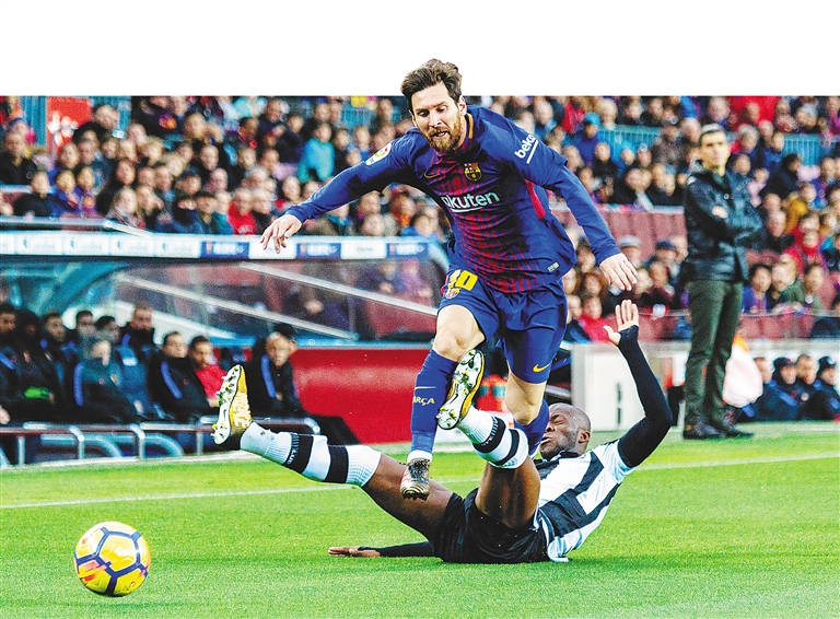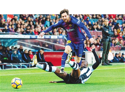 北京时间1月8日,在西甲联赛第18轮比赛中,巴塞罗那队主场以3:0战胜莱万特队,前场三叉戟梅西、苏亚雷斯和保利尼奥各入一球。此战过后,巴萨取得15胜3平积48分的成绩,在积分榜上以9分优势领先排名第二的马德里竞技。图为巴萨球员梅西(上)在比赛中带球突破。 新华社发