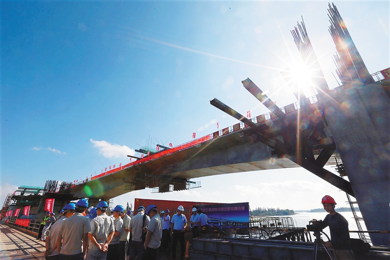 “全长2.4公里的万泉河特大桥是文琼高速公路重点控制性工程,桥梁主墩横跨万泉河,是我省目前已建和在建的最长一座高速公路桥梁,也是全线技术含量最高、质量要求最严、施工工艺最复杂的一座桥梁。”中铁建大桥工程局一公司文琼高速四标段总工程师邹仁智说,为了确保浇筑质量,施工人员都是选择每天气温最低的凌晨一两点钟进行作业,“许多夜晚都是这么奋战过来的。”