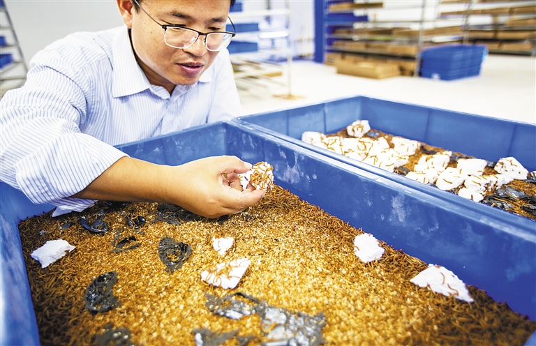 “黄粉虫降解塑料只需要24个小时。”三亚南繁院研究员杨小锋解释道,500条黄粉虫在30天里可以吃1.8克的塑料,吃下去的塑料一半转化为二氧化碳,另一半则转化为类似兔粪便的生物降解颗粒作为肥料,“养殖黄粉虫7个多月来,已经产生了近500斤肥料。”