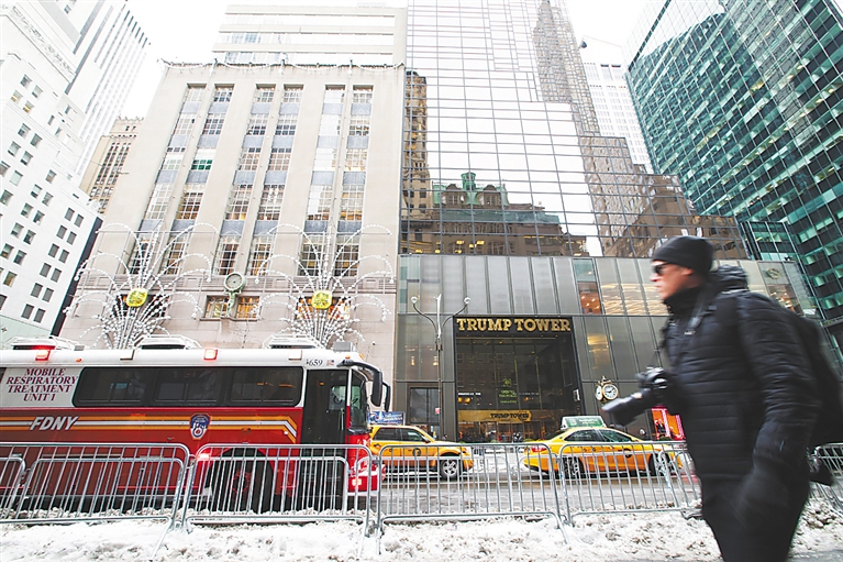 这是1月8日拍摄的美国纽约特朗普大厦。 当天,位于美国纽约的特朗普大厦楼顶一座冷却塔因电气故障发生小型火灾。目前火已被扑灭。 新华社记者 王迎 摄