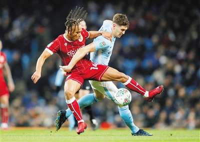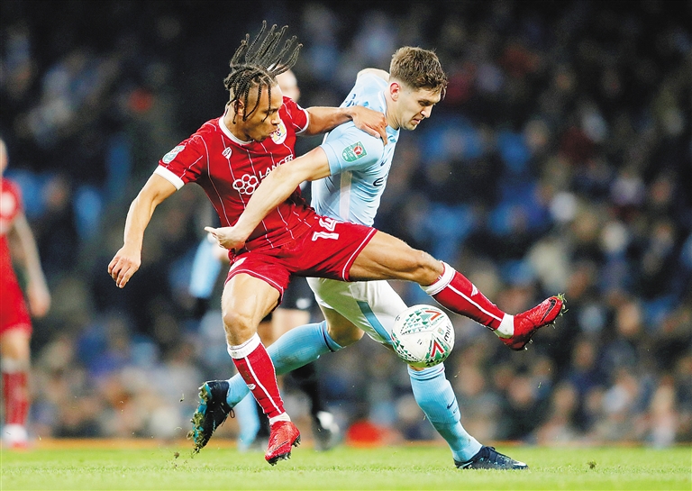 北京时间1月10日,在英格兰联赛杯半决赛首回合比赛中,曼城在主场以2:1战胜英冠球队布里斯托尔城。图为曼城球员斯通斯(右)与对手拼抢。