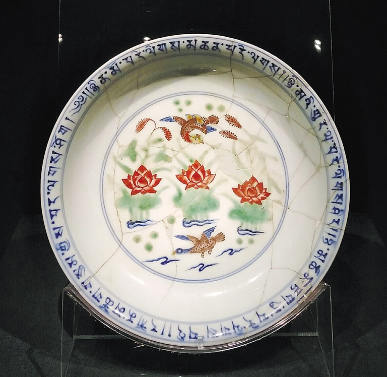 海口市博物馆所藏的这件斗彩莲池鸳鸯纹盘,口径25.2厘米,足径15.5厘米,高4厘米,敞口,浅腹,圈足。胎体轻薄,造型规整,釉面光滑,内壁口沿以青花梵文吉祥语装饰一周,字体工整隽秀;内底与外壁采用斗彩装饰手法绘莲池鸳鸯纹,莲荷红艳盛开,浮萍荡出碧波,画面错落有致,施彩清新淡雅;底部绘双圈画押款,为清雍正时期仿明成化斗彩之佳作。
