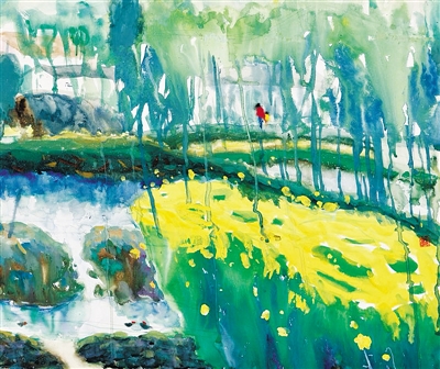 他的画作里,总是有他的经历,就像新作《琼北之春》。他说,这是一个入春的琼北乡下,嫩绿的草儿让人心醉,颜料管里的淡绿似乎略显苍白,唯有加入一点淡黄才正对味儿。浅水滩的杂草喧闹着拥挤在一起,似乎存心要扰乱草地与水塘精心营造的宁静。正是大自然的包容与博爱,才让世界如此美丽而多彩。