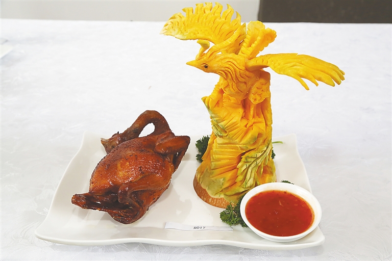 北岸脆皮鸡,食材是产于儋州北岸地区火山岩地带、农村人散养的小种肉鸡,又称儋州鸡,主要吃野果、青草、杂虫、稻谷、玉米、番薯生长,骨头坚硬,肉质香甜。