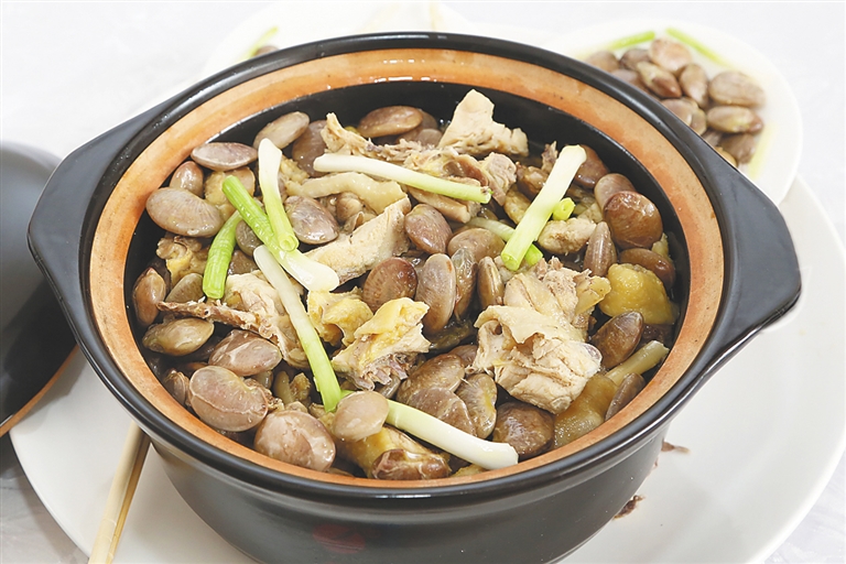 板栗阉鸡煲,以儋州鸡和板栗为主食材,通过新颖的烹调方法使两者原料营养更加融和,味美清香,口感层次感强。