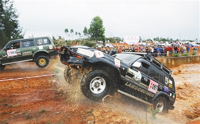 越野e族第十届海南汽车越野场地挑战赛13日在海口开赛。本次赛事由越野e族海南大队、海南省汽车运动协会、海南领航者山地越野运动俱乐部联合主办,来自海口、三亚、琼海、昌江等市县的120名赛车手驾驶改装赛车参赛。图为两位车手驾驶赛车驶出赛道深水坑。