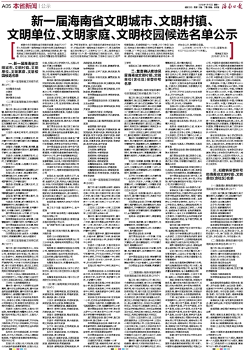 新一届海南省文明城市、文明村镇、文明单位、文明家庭、文明校园候选名单公示