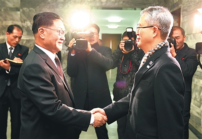1月15日,在板门店朝方一侧,朝韩双方代表举行会晤前握手。 朝韩双方代表15日在板门店朝方一侧的统一阁会晤,双方就平昌冬奥会和冬残奥会之际朝方派艺术团赴韩演出一事达成一致。
